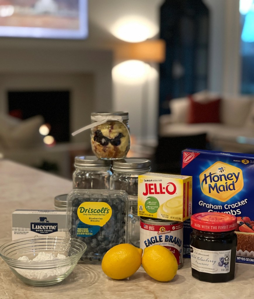 Fill 8 oz jelly jars, with a of layer graham cracker crumbs, cheesecake mixture, and blueberries; repeat layering, ending with blueberries. Sprinkle a few cracker crumbs on top. Seal with screw top lid and refrigerate.
